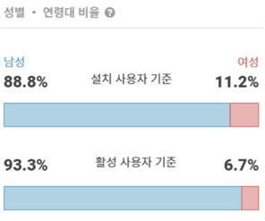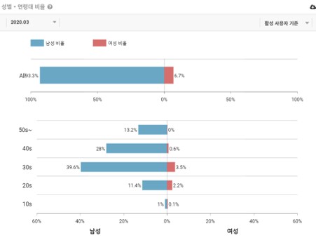 여성의 모수가 점차적으로 증가하고 있지만, 절대적인 비율에 있어서는 아직까지는 남성 사용자들이 압도적입니다. 조금 더 자세하게 연령별 비율 데이터도 살펴보겠습니다.