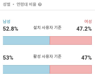 '코레일톡' 앱의 남녀 성별 비율 그래프입니다. 설치 사용자 기준으로 남성 52.8%, 여성 47.2%로 유사한 수치 기록했습니다. 활성 사용자 기준도 남성 53%, 여성 47%로 설치 사용자 기준과 크게 차이 나지 않는 수치를 보여주었습니다. '코레일톡'앱은 남녀의 특정 성별의 선호가 따로 존재 하지 않고 성비 구분 없이 '코레일톡' 앱을 이용하는 것으로 보입니다.