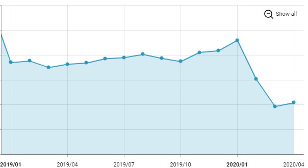 2020년 1월 이후에는 급격하게 그래프가 하락하는 모습을 확인할 수 있는데요. 이는 코로나19 이슈로 인해 '사회적 거리두기'의 실천으로 외부 지역으로의 이동이 줄어들었기 때문이라고 보입니다. '코레일톡' 뿐만이 아니라 국내/해외 이동 교통 서비스 앱들은 대부분 비슷한 수치 동향을 보이지 않을까 싶습니다.