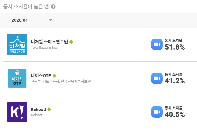 '줌' 앱과 동시 소지율이 높은 상위 3개 앱입니다. 가장 높은 동시 소지율(51.8%)을 기록한 '티처빌 스마트연수원'앱 입니다. '티처빌 스마트연수원' 앱은 선생님들을 위한 통합 교육 서비스 플랫폼입니다. 그다음으로 높은 동시 소지율(41.2%)을 기록한 앱은 '나이스OTP' 앱입니다. 교육부, 시도교육청, 한국 교육 학술 정보원 로그인 시 본인 인증을 위한 OTP 서비스입니다. 그리고 'Kahoo!' 앱이 동시 소지율(40.5%) 3위를 차지했습니다. 'Kahoo!' 앱은 아이들 대상으로 퀴즈쇼를 할 수 있는 교육 관련 앱입니다.