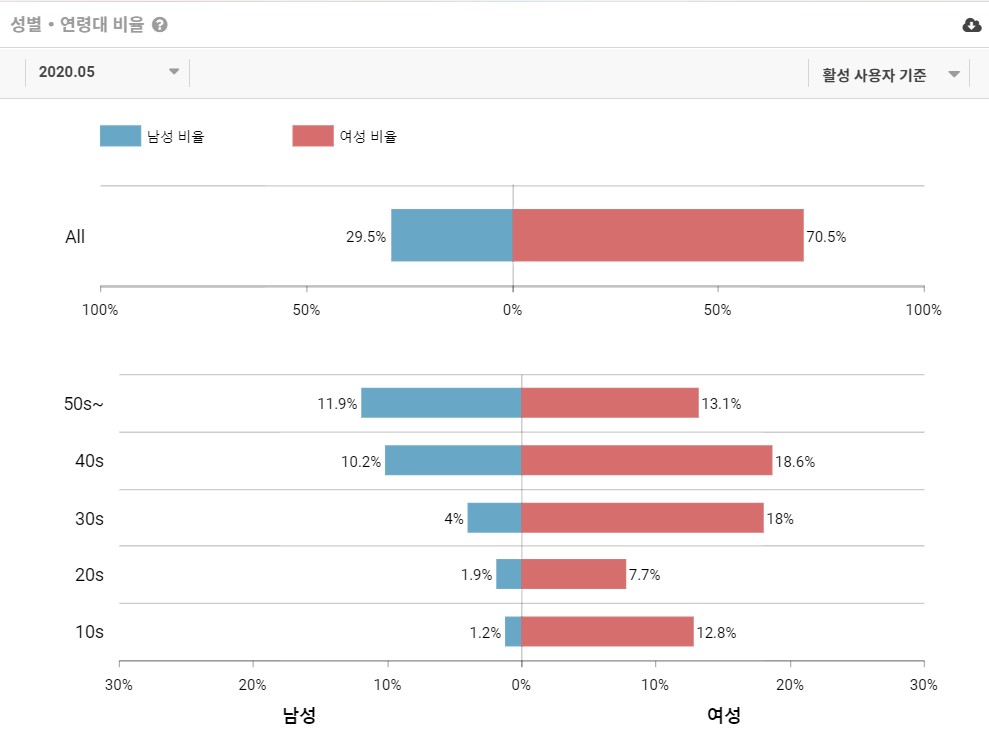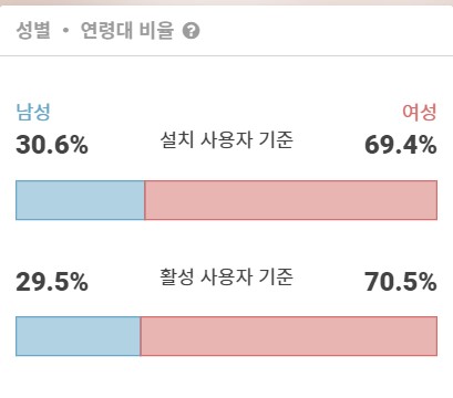 설치하는 사람과 실제 사용자 모두 여성의 비율이 높은 것으로 기록되었습니다. 단순 수치로 환산해본다면 10명이 있으면 7명은 여성 사용자, 3명은 남성 사용자라고 볼 수 있겠네요. 조금 더 자세하게 연령대/성별 데이터도 살펴보겠습니다.