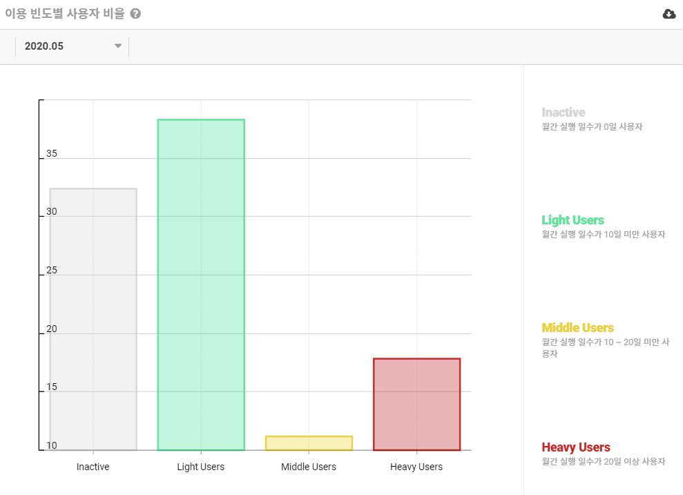 '제페토' 앱의 이용 빈도별 사용자 비율 그래프입니다. 그래프를 살펴보시면 Light Users(월간 실행 일수가 10일 미만인 사용자)의 비율이 가장 높게 나타났습니다. 그리고 Inactive(월간 실행 일수가 0일 사용자)가 그다음을 잇긴 했지만 Heavy Users(월간 실행 일수가 20일 이상 사용자)가 그 다음을 기록했습니다.