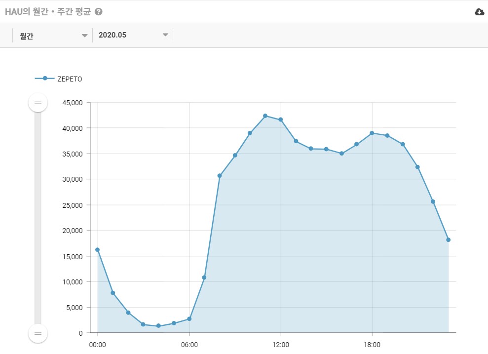 '제페토' 앱의 활성 시간대 그래프입니다. 해당 그래프를 통해 사용자들 언제 '제페토' 앱에 가장 많이 접속하는지 확인해볼 수 있습니다. 그래프를 살펴보면 오전 8시부터 급격하게 그래프가 상승하여 오후 6시 이후부터 점차 떨어지는 것을 확인할 수 있습니다.