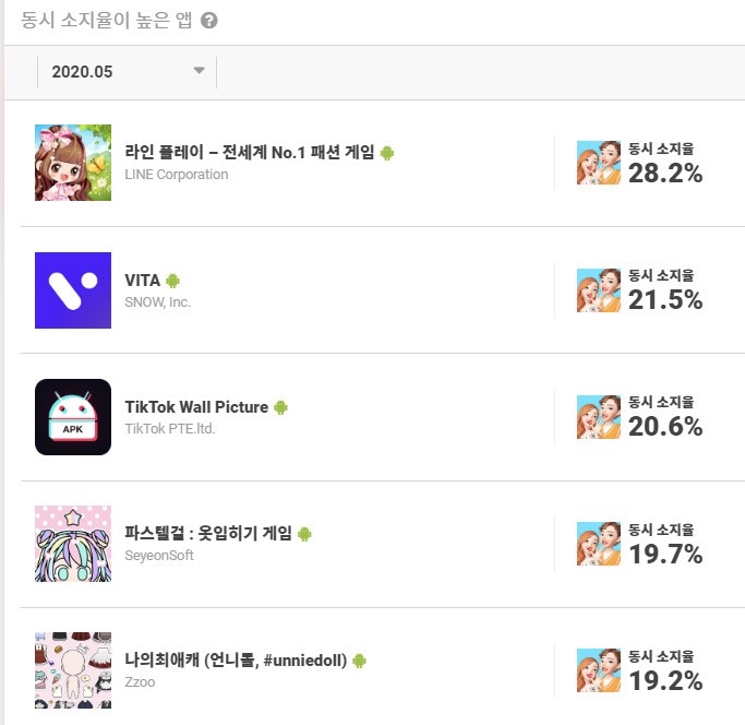 동시 소지율이 높은 5개 앱 중 나머지 2개 앱은 숏비디오 플랫폼 '틱톡' 앱과 비디오 편집툴 'VITA' 앱입니다. 동영상 콘텐츠에 관심이 많은 성향의 사용자들이 '제페토' 앱을 사용하는 것으로 볼 수 있겠네요.