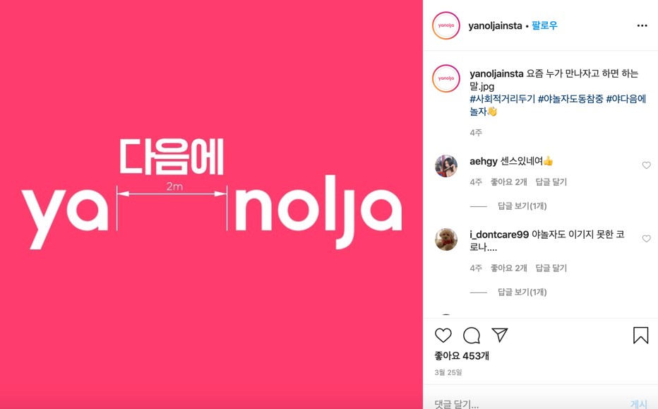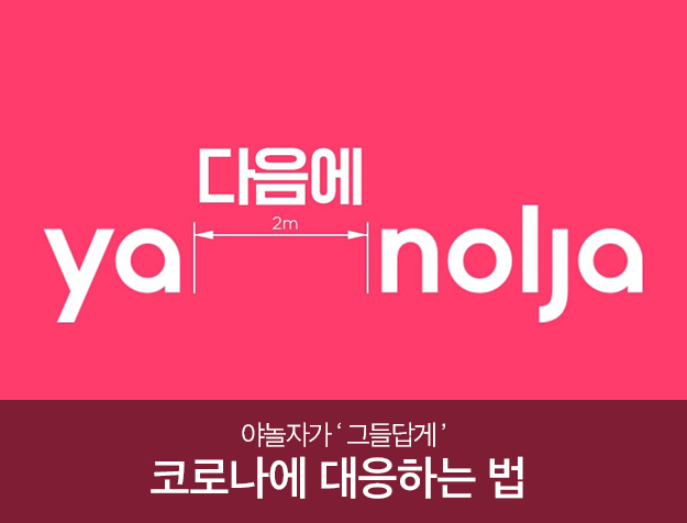 많은 회사들이 인스타그램을 한다. 페이스북도 한다. 하지만 콘텐츠들은 하나같이 거기서 거기다. 서로 서로 복제와 카피를 반복한 듯 비슷한 내용들만 쏟아진다. 로고를 가리면 어떤 브랜드의 콘텐츠인지, 이벤트인지, 프로모션인지도 구분하기 힘들다. 하지만 야놀자는 다르다. 예를 들이 이들이 '사회적 거리 두기'에 대한 캠페인을 어떻게 보여주고 있는지를 인스타그램 게시물을 통해 한 번 살펴보자. 보았는가. 기발하지 않은가. 2m 거리두기와 함께 '다음에' 놀자고 말한다. 오직 텍스트 뿐인 이 콘텐츠에 감탄한 사람이 나 뿐만은 아닐 것이다.
