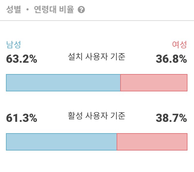 '하쿠나 라이브' 앱의 성별 비율을 확인해보겠습니다. 설치 사용자 기준으로 남성 63.2%, 여성 36.8%으로 남성 비율이 여성에 비해 근소하게 높은 편입니다. 활성 사용자 기준은 남성 61.3%, 여성 38.7%로 설치 사용자 기준과 크게 차이 나지 않는 모습입니다. 대체적으로 10명 중 6명은 남자, 4명은 여자라고 볼 수 있겠네요. 이 정도 수치면 특정 성별에 치우치지 않고 남녀가 모두 좋아할 만한 서비스라고 판단할 수 있을 거 같습니다.