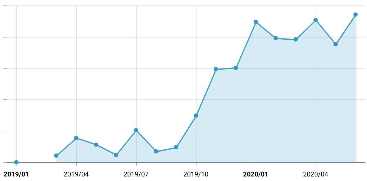'하쿠나 라이브' 앱의 월간 활성 사용자 수 추이 그래프입니다. 지난 19년 3월 말 한국 론칭 이후 크게 성장하고 있는 모습입니다. 특히 19년 10월을 기점으로 월간 활성 사용자 수 추이가 큰 폭으로 상승했습니다. '하쿠나 라이브' 앱은 작년 하반기 유튜브 등에서 바이럴 영상 광고 집행을 진행하고 19년 12월에는 래퍼 서동현을 광고 모델로 섭외하는 등의 마케팅 활동이 활성 사용자 수 성장에 큰 역할을 한 것으로 보입니다.