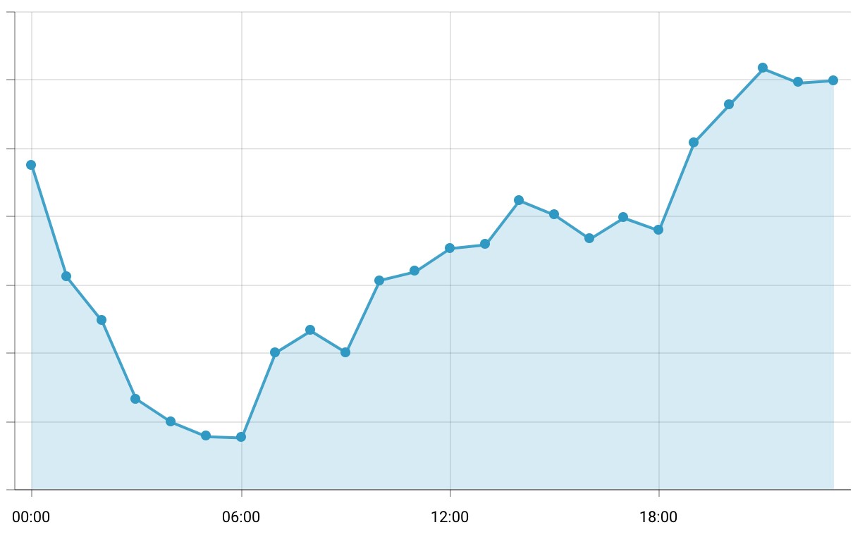 '하쿠나 라이브' 앱의 시간대 별 활성 사용자 추이 그래프입니다. 오전 6시를 기점으로 점점 상승하다가 오후 6시 이후로 높은 활성 사용자 수를 기록하고 있습니다. 아무래도 실시간 소통을 제공하는 서비스다 보니 주요 일과시간이 끝나고 밤 시간대에 많이 접속하는 것으로 보입니다.