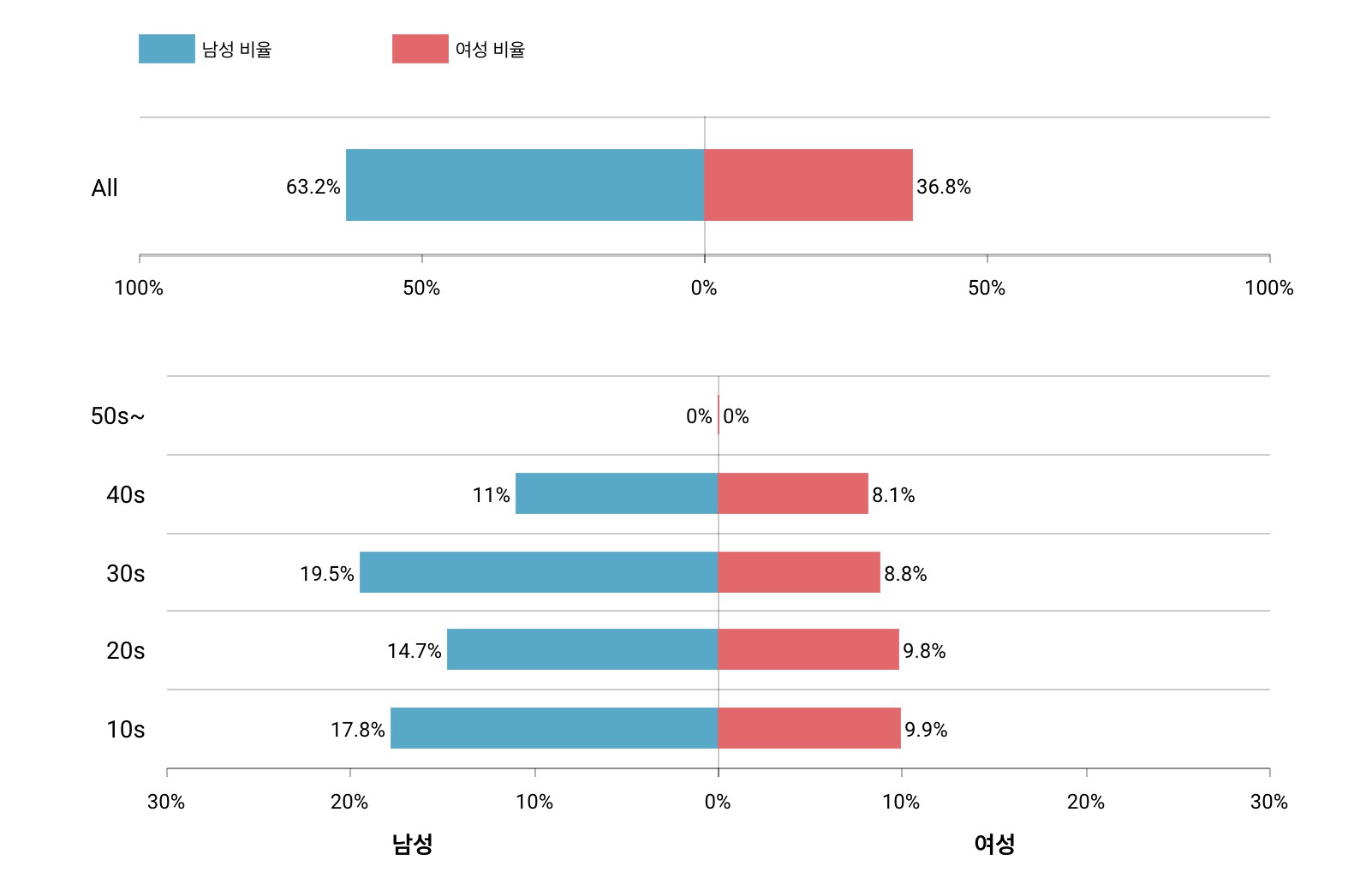남성/여성의 연령대 별 비율이 확연하게 차이가 나는데요. 남성은 30대가 가장 높은 반면, 여성은 30대가 가장 낮게 나타났습니다(50대 이상 제외). 그 밖에도 남성은 1020대 비율이 높은 반면 여성은 40대 비율이 높은 모습을 보여주었습니다.