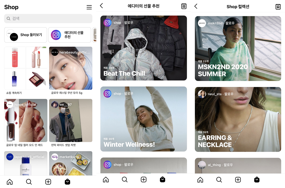 2. 인스타그램 쇼핑 탭에서 에디터의 선물 추천, Shop 컬렉션 등 상품을 다양하게 맞춤 큐레이션하여 제공한다.