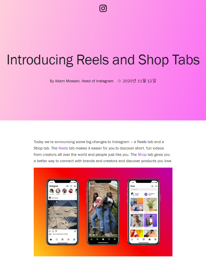 이번에 인스타그램 홈 화면 개편을 통해 새로운 탭이 추가되었다면서 릴즈 탭과 쇼핑 탭을 소개하는 글이었습니다. 국내에서는 릴즈 탭은 아직 추가되지 않았고, 쇼핑 탭만 새로 생겼습니다.