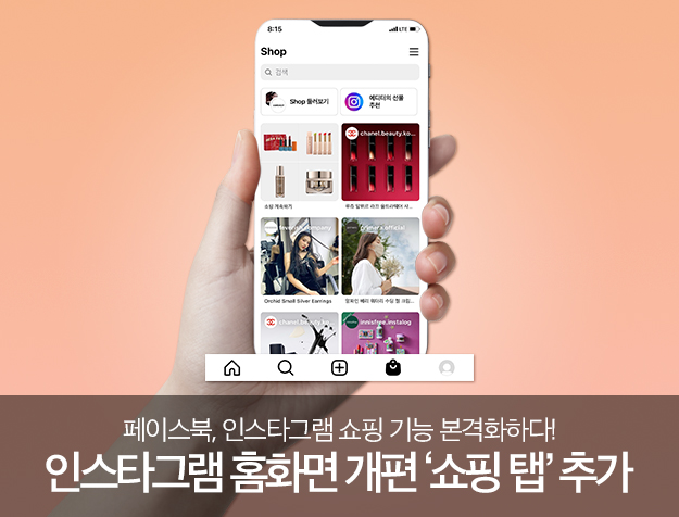 하트(❤) 표시로 있었던 ‘계정 활동’이 상단 메시지 옆으로 위치가 옮겨지고, 그 자리에 ‘쇼핑 탭’이 생성된 것인데요. 오랜 시간 동안 큰 개편 없이 홈 화면을 유지하던 인스타그램의 이번 홈 화면 UI 개편은 어떤 의미를 갖고 있을까요?