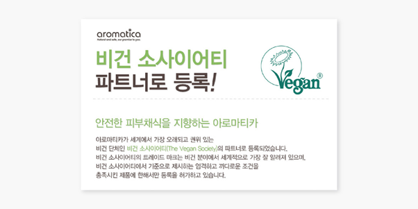 #어떻게 : 비건 브랜드는 동물실험과 성분을 배제하고 식물 성분에 기초해 만드는 브랜드를 말한다. 세계에서 가장 오래되고 권위 있는 비건 단체인 '비건 소사이어티'의 정식 파트너로 등록되기도 한 아로마티카는 특히 멸종 위기의 식물은 사용하지 않는 윤리적인 브랜드기도 하다. 이외에도 유해 성분으로 의심되는 성분을 철저하게 배제하고 있다. 또한 어려운 아이들과 몸이 불편한 장애우를 돕고, 지역 교회 및 단체를 지원하며 도움이 필요한 곳을 찾아 봉사하는 등 선한 영향력을 행사하고 있다.