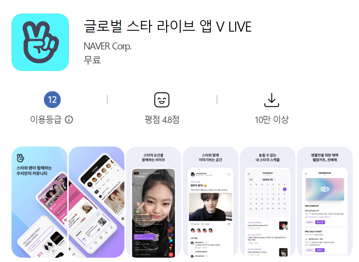 그 첫 번째는 언택트 덕질의 시초격이라 볼 수 있는 어플 브이라이브. 브이라이브는 네이버에서 서비스하는 인터넷 방송 플랫폼으로 코로나 이전부터 아이돌의 팬들에게는 익숙하고 친근한 어플 중 하나다. 이 어플은 각 소속사가 채널을 만들어 아티스트의 사진과 글을 올리고 라이브 방송을 할 수 있는 새로운 플랫폼이다. 또 팬들은 라이브 방송에 직접 채팅을 하고 실시간으로 소통하는 것이 가능하다. 아티스트가 원하는 시간에 원하는 장소에서 편하게 팬들과의 만남을 진행할 수 있다는 점이 브이라이브의 큰 강점이다. 브이라이브는 라이브는 무료로 참여할 수 있지만, 일부 VOD FANSHIP서비스는 유료로 제공하고 있다. 또한 최근에는 단순한 라이브 방송뿐 아니라 브이라이브를 활용한 다양한 콘서트와 팬미팅이 성행하고 있다.