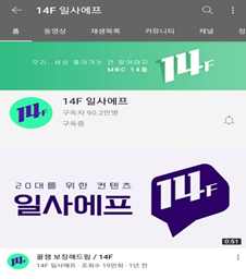 오늘은 저와 제 주변에서 관심 있어하는 유튜브 채널 '14F'를 소개하려고 합니다. 다른 유튜브 뉴스 채널에서도 기획 플랫폼을 다루지만, 14F에서는 다양한 시도가 이루어지기 때문입니다. 취향에 맞게 다양하고 유용한 콘텐츠를 제공하고 있죠. 이를테면, 매일 전해주는 콘텐츠 중에 가로로 촬영하여 강다솜, 영은 아나운서가 직접 이야기해주는 콘텐츠가 있는데, 청년세대의 이야기로 공감대를 이끌어 내고 있습니다.