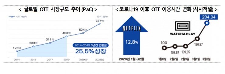 코로나19가 계속되는 상황 속에서 거리두기로 인해 혼자 시간을 보내는 사람들이 OTT 서비스를 이용하며 사용자가 급증하고 있다. 글로벌 OTT 서비스의 대표 플랫폼인 넷플릭스는 1억8000만명의 가입자 수(2020.4 기준)를 넘었고 국내 OTT 서비스인 왓챠의 가입자 수는 724만명(2020.8 기준)이다. 넷플릭스, 왓챠 이외에도 Wavve와 같은 지상파 방송 사업자 기반 서비스와 유료 방송 사업자 기반 서비스인 티빙 같은 경우도 꾸준히 이용자 수가 증가하고 있다.