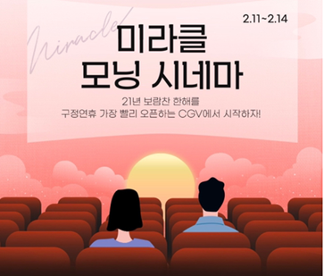 바로 숙박업에서 이 키워드를 사용한 사례입니다. 신라스테이는 이런 미라클 모닝을 실천하고 도전하는 사람들을 위한 패키지를 내놓았습니다. 좋은 숙면이 있어야 활기찬 하루의 시작이 가능하다는 컨셉으로 수면과 트레이닝을 강조했습니다. Iot를 활용해 일출 시뮬레이션을 구현하고, Ai를 활용해 자세교정을 해주며, 개인의 홈트레이닝을 돕습니다. 영화업계에서도 이를 활용한 마케팅이 있었습니다. 올해 2월cgv는 ‘미라클 모닝 시네마’라는 이름으로 구정 연휴기간 이벤트를 진행했습니다. 7시 즈음 상영되는 영화를 관람한 관객에게 모닝 키트를 증정하는 것입니다. 플래너와 다이어리, 에코백, 파우치, 선식 등 푸짐한 선물이 키트에 포함되어 있었습니다.