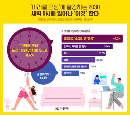 미라클 모닝은 아침에 대단하고 거창한 계획을 실천해야만 하는 것이 아닙니다. 오히려 아침의 짧은 시간을 본인이 설정한 사소한 계획을 꾸준히 실천하는 것을 목표로 하고 있습니다. 알바천국에선 미라클 모닝 루틴을 실천하고 있는 개인 회원 846명을 대상으로 설문조사 했습니다. 가장 많은 비율을 차지한 것이 아침 운동으로 44%의 수치를 기록합니다. 이들은 홈트레이닝이나 조깅 등 아침 시간 식전에 몸에 무리가지 않을 만큼의 짧고 가벼운 운동을 하는 것이 주를 이루었습니다. 이처럼 오전 시간 헬스나 과격한 운동을 하는 것이 아니라 가벼운 강도의 운동을 통해 하루를 상쾌하게 시작하려는데 목표가 있습니다. 그 다음은 30.6%, 25.2% 정도의 비율로 공부나 독서 등이 주를 이뤘습니다. 이 역시 브이로그, sns 인증 등을 다수 살펴보면 과도한 목표를 세우지 않습니다. 하루에 외국어 10개의 단어, 5개의 문장을 외우거나 혹은 10분 정도의 자격증 공부를 꾸준히 하는데 목표가 있습니다.