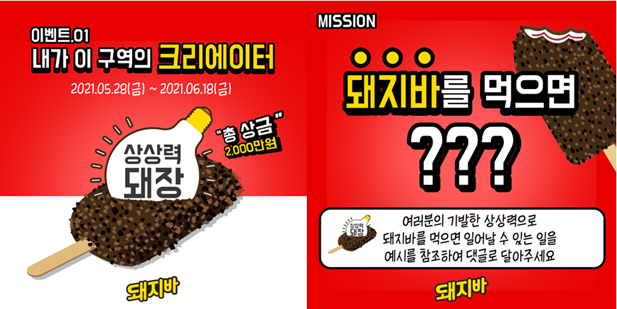 7월 상상력 돼장 시리즈는 제 3탄을 공개할 예정입니다. 이 3탄은 소비자 참여 광고로, 소비자가 댓글로 돼지바를 먹고 생길 수 있는 기발한 아이디어를 제공합니다. 1등에겐 해당 아이디어로 된 광고제작과 상금에 이어 자신이 낸 상상력으로 직접 셀럽이 노래와 뮤직비디오를 만들어주는 엄청난 기회를 얻게 됩니다. 이 셀럽은 주라주라로 유명한 ‘다비이모’(김신영 트로트 부캐)입니다. 다양하게 아이디어를 내준 이들에게 고루고루 상품이 돌아갈 수 있도록 여러 상품들이 많이 준비되어 있습니다. 2237개의 댓글이 달릴 만큼 많은 사람들이 아이디어 제공에 참여했습니다. 당장 광고로 만들어지면 엄청 웃음을 자아낼 것 같은 아이디어가 다양하게 나와있고 이런 댓글을 읽어보는 것도 또 하나의 재미입니다. 과연 어떤 것이 선정되어 저 영광을 누리게 될지, 이 텍스트가 어떻게 광고로 구현될지 기대하게 됩니다.