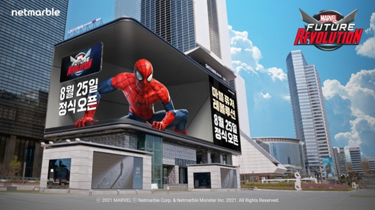 뿐만 아니라 올해 모바일 액션 RPG 게임 ‘마블 퓨처 레볼루션’을 출시한 넷마블 역시 같은 장소에 마블 히어로들을 메인 모델로 앞세운 옥외광고를 진행했습니다. 이 역시 정식 출시일을 크게 전면에 내세우며 스파이더맨, 캡틴 아메리카 등의 캐릭터들이 마치 곧바로 튀어 나올 것만 같은 생동감을 살렸습니다. 그리고 넷마블은 이러한 막 화면을 뚫고 나올 것 같은 기술을 3D 아나몰픽 기법이라고 표현하며 이를 활용해 제작했다고 밝혔습니다.