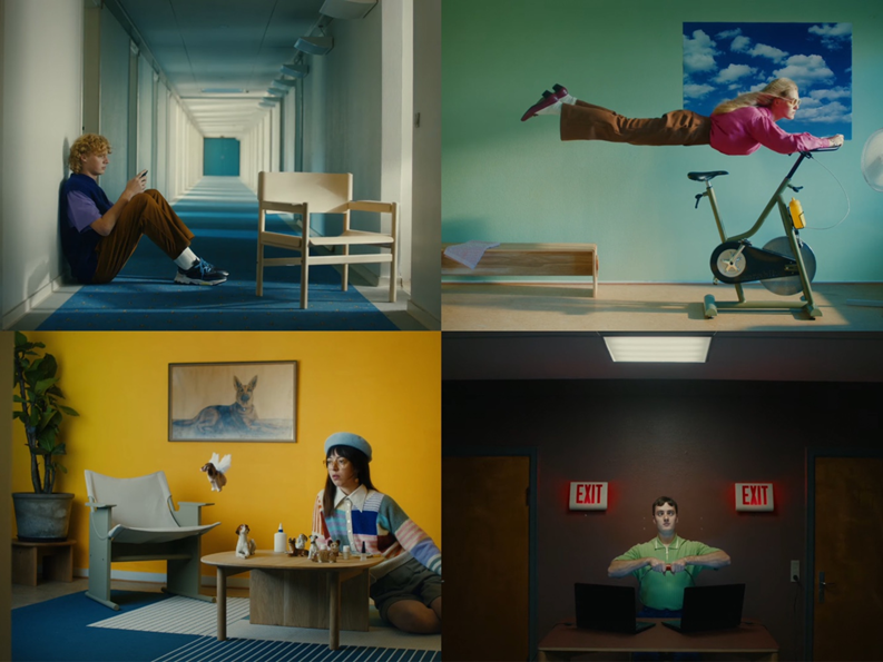 하지만 주목할만한 부분은 단순 광고의 내용에서 그치지 않습니다. 이 광고는 시각적으로 매우 만족스러움을 주는 감각적인 영상이라고 생각합니다. 영상은 배경 및 소품, 의상 등에서 파란색, 분홍색 x 민트색, 노란색 등 원색의 쨍한 색감을 살려 강조했습니다. 색감의 배치를 잘 해 보는 이로 하여금 매우 세련된 영상이라는 생각을 하게 합니다. 정말 잘 만든 영화 한 편의 티저를 보는 것 같다는 생각도 들게 하는 이색적인 광고입니다.