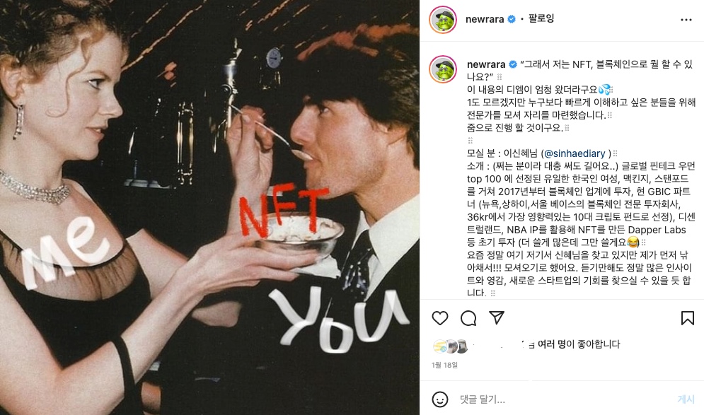 그리고 여기 또 MZ세대를 겨냥한 재미있는 NFT 프로젝트가 있습니다. 바로 유튜브 채널 <박막례 할머니>로 유명한 김유라 PD의 NFT 프로젝트예요. 일찍이 코인과 NFT에 대한 관심이 컸던 그는 먼저 커피챗으로 많은 사람에게 정보를 알려주기 시작했어요. 30분 가량 동안 굵직한 정보만 모아서 NFT가 무엇인지, NFT를 통해 사람들이 무엇을 얻을 수 있는지, NFT를 시도해보기 위해서는 무엇이 필요한지 등 초보자를 위한 시간을 마련했죠. 커피챗은 매 시간 1000여 명이 넘는 사람들이 참여하면서 관심이 꺼질 줄 몰랐어요.