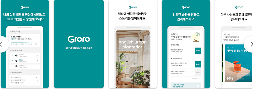 또 하나 주목할 점은 ‘그로로’가 단순히 식물에 대한 매거진이 아니라는 점입니다. ‘의미 있는 나의 일상 만들기’라는 캐치프레이즈에서 알 수 있듯이 그로로의 강점은 단순히 ‘식물’을 잘 키우기 위한 매거진일 뿐만 아니라, ‘나의 루틴’을 지켜나가고 습관화하는 한 가지 방법으로 식물에 대한 관점을 세운다는 점이에요. 그로로의 앱 버전은 그런 점에서 식물 매거진을 자처하지만, 관련된 글을 볼 수 있는 기능 뿐만 아니라 식물과 무관하게 일상 루틴을 관리해주는 기능, 그리고 자신의 루틴을 다른 사람과 공유하는 기능들이 주요한 서비스 내용이기도 합니다.