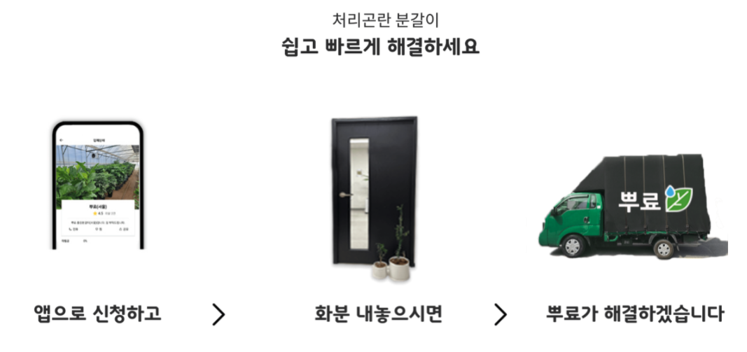 '뿌료' 역시 내 식물을 등록하고 주기적인 알람을 받을 수 있는 서비스입니다. 뿐만 아니라 똥손들이 가장 힘들어한다는 '분갈이'를 출장서비스로 제공한다는 점에서 특색있는 앱이라고 할 수 있죠. 또 내 식물에 맞는 정보들을 앱을 통해서 검색할 수 있다는 점도 특별해요.