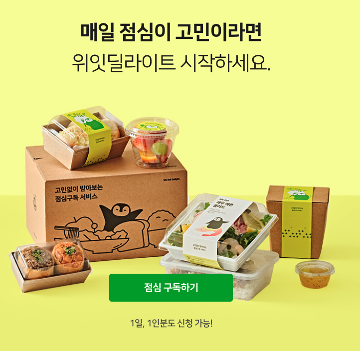 점심구독 서비스인 위잇딜라이트 역시 매일 점심 뭐 먹을지, 어디로 갈지 고민하는 사람들을 타겟으로 준비된 서비스입니다. 1인분도, 하루 주문도 가능하다는 점이 강점이죠. 점심 고민에서 해방될 수 있지만, 매일 2가지 메뉴 중에서 선호하는 음식을 선택할 수 있다는 것도 한정된 선택지 안에서 취향대로 고를 수 있다는 장점이죠.