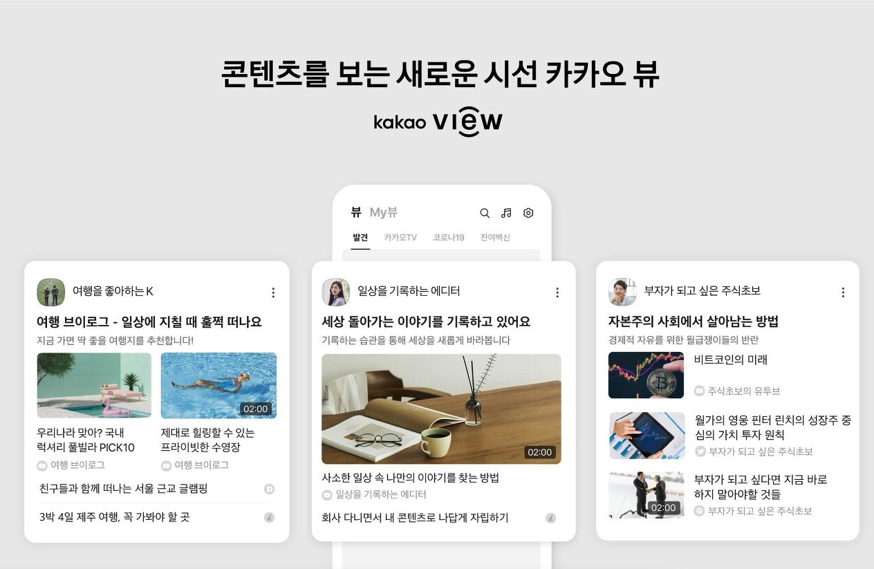 카카오뷰는 다양한 관점과 시선에서 선정된 콘텐츠를 볼 수 있는 큐레이션 서비스예요. 예를 들어 '카카오TV'의 카카오뷰를 팔로우하면 카카오TV가 선정한 콘텐츠만 모아볼 수 있는 거죠. 중요한 건 기업뿐만 아니라 개인도 이 큐레이션을 발행할 수 있어서 각자의 개성 넘치는 콘텐츠 리스트를 들여다볼 수 있다는 점입니다. 매일의 이슈부터 정치, 경제, 시사까지 '누가' '어떤 기준으로' 콘텐츠를 모았느냐가 맹점이 되는 셈이죠. 게다가 구독자를 모아 커뮤니티를 형성할 수 있고, 많은 사람들이 찾는 채널이 되면 수익으로 연결될 수도 있습니다. 그렇다면 우리 브랜드의 관점이 잘 드러나는 카카오뷰를 만들 수 있을까요?