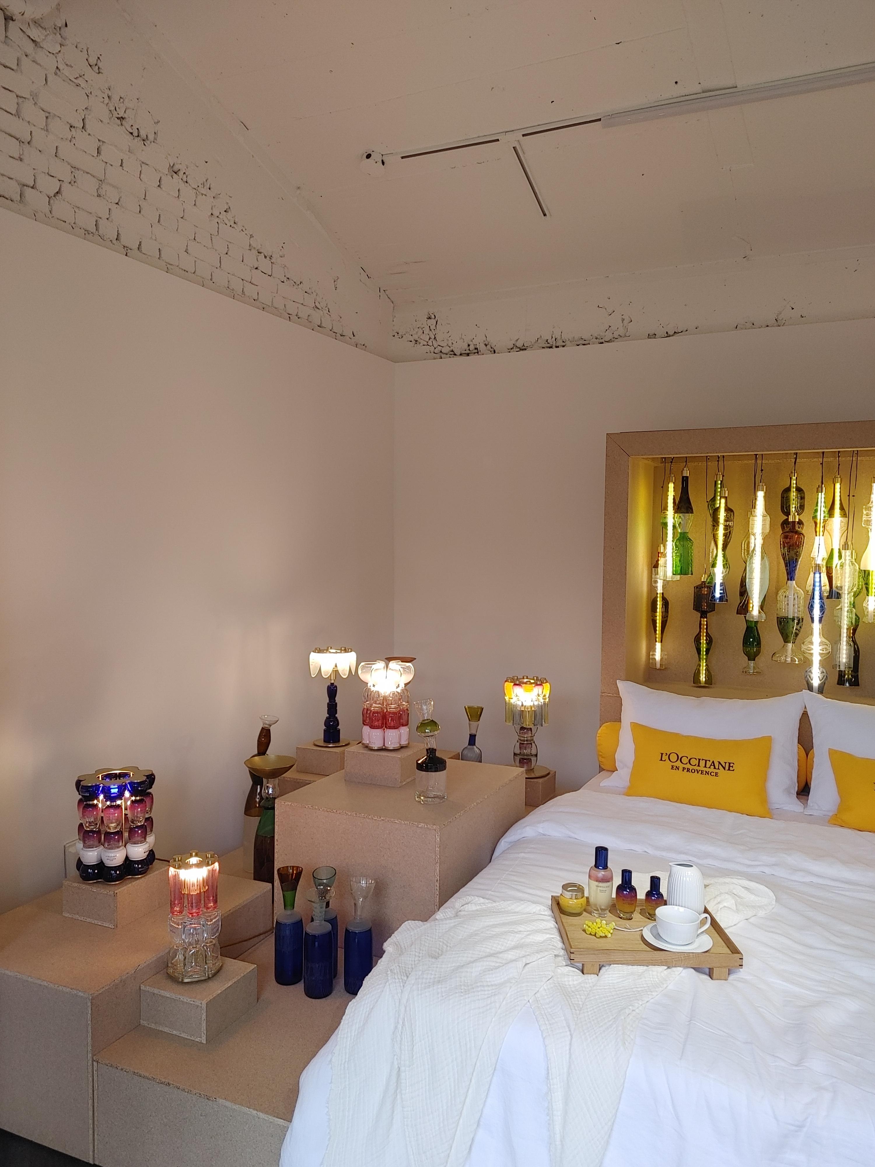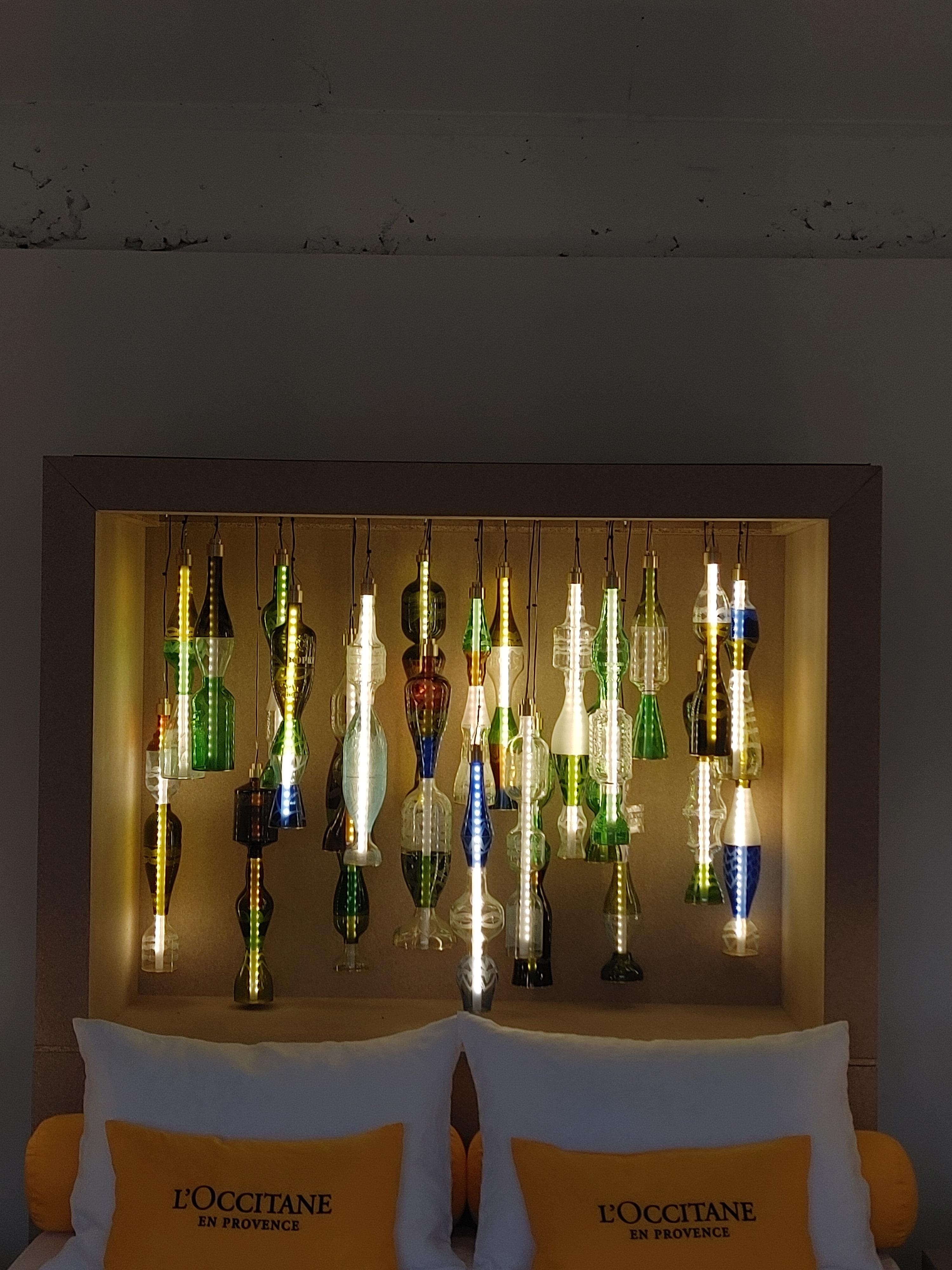 여긴 침실 공간인데요. 자연광만 들어오는 어두운 방에 조명들이 설치가 되어있어요. 록시땅의 화장품 공병으로 제작한 조명들입니다. 가까이서 보면 록시땅의 상표가 보이는데, 멀리 서는 그냥 조명처럼 보여요. 공병을 뒤집으니 원래 조명으로 디자인된 것처럼 어울려서 재밌어요.