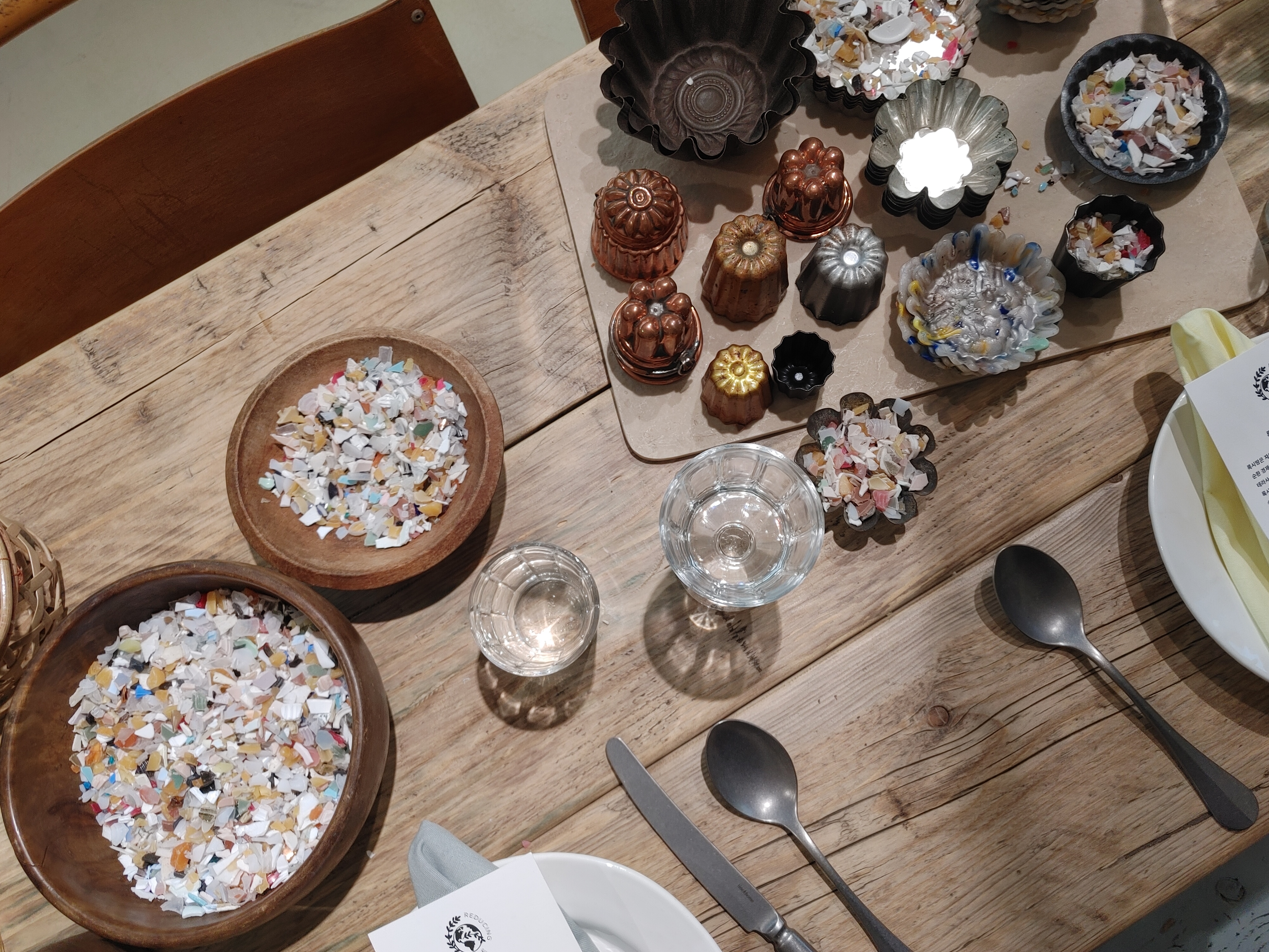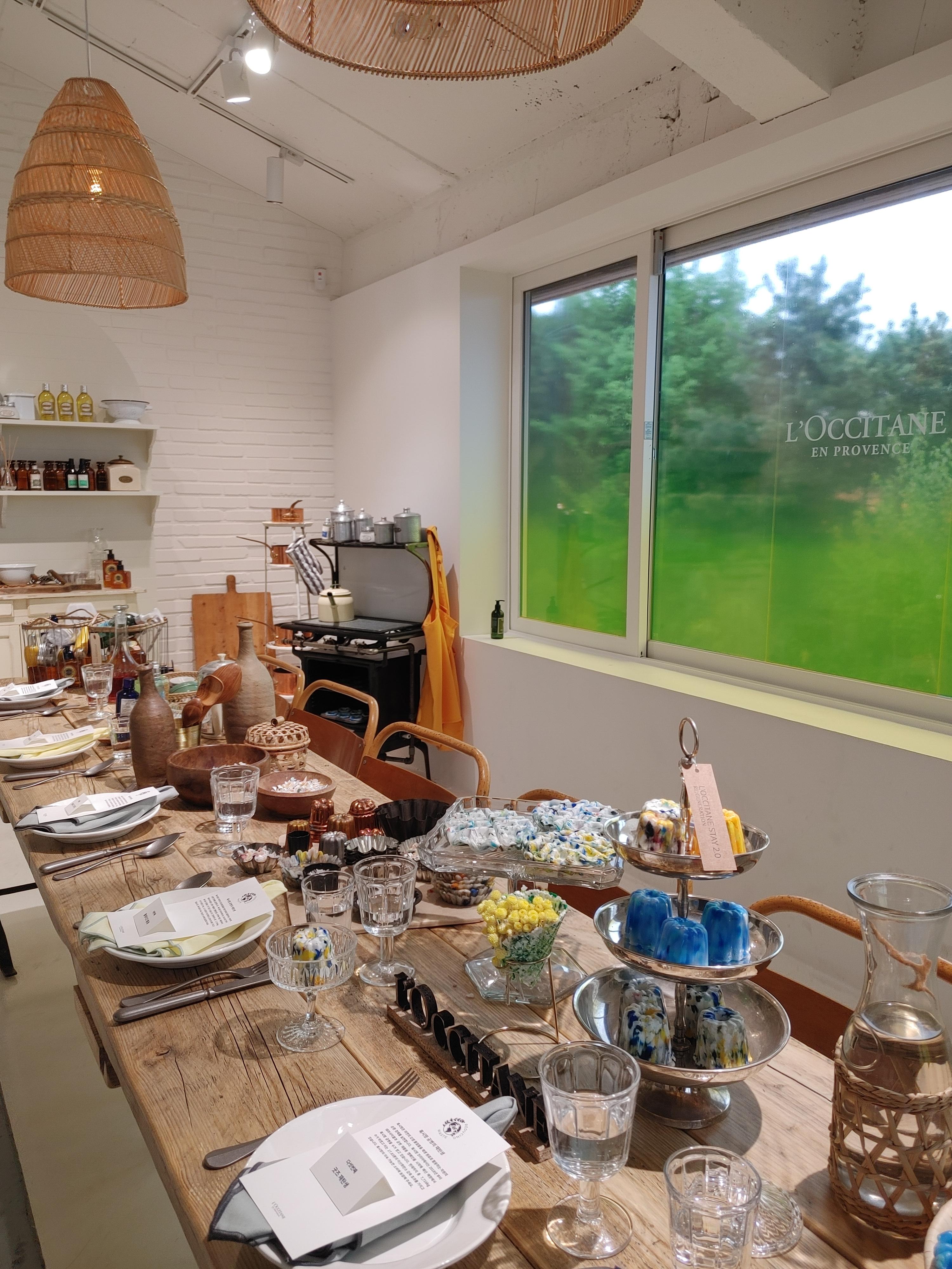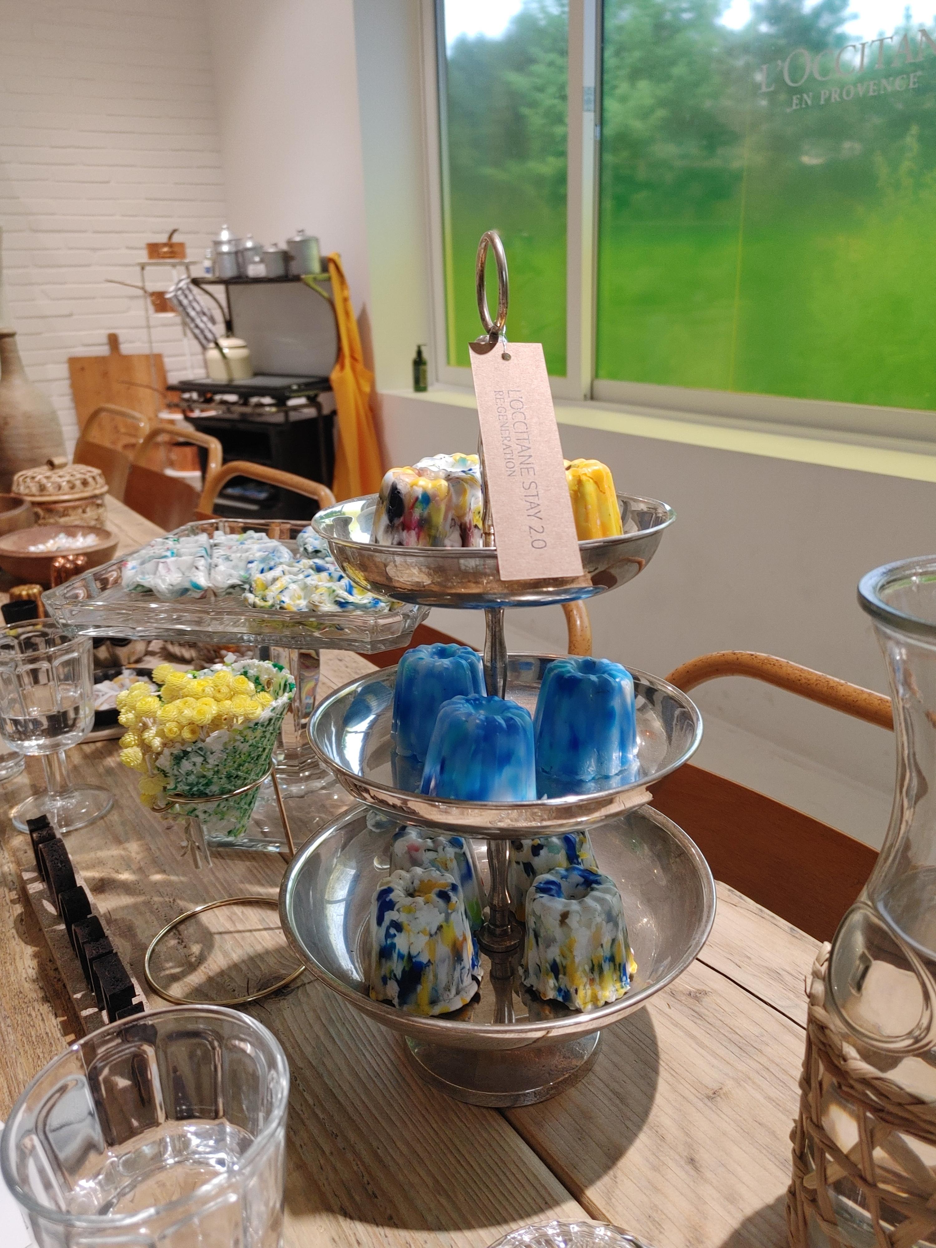 여긴 다이닝룸을 컨셉으로 잡았어요. 방에 들어가자마자 눈을 사로잡는 건 폐플라스틱으로 만든 알록달록한 까눌레네요. 뿐만 아니라 베이킹 툴 같이 생긴 것들은 트레이로도 활용이 가능하다고 하는데, 상품을 구입하면 선물로 증정하기도 합니다.