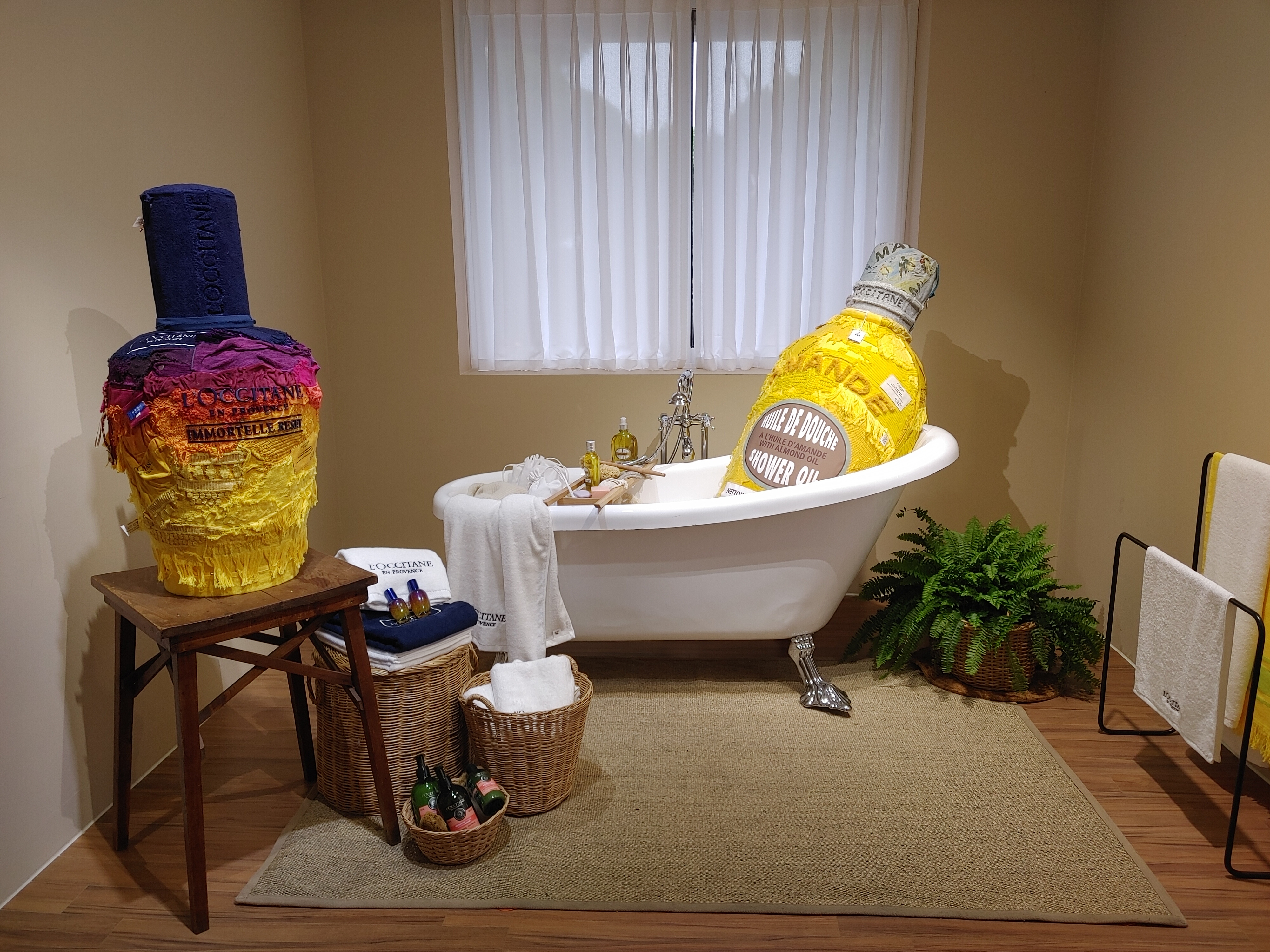 전시장 안의 각각의 방들에는 컨셉에콘셉트에 맞춘 업사이클링 작품들이 전시되어있었는데요. 헌 에코백을 모아서 록시땅의 제품으로 형상화한 모습이죠. 욕실 콘셉트에 맞춰서 천 소재를 이용했기 때문에 아늑한 느낌이 들어요.