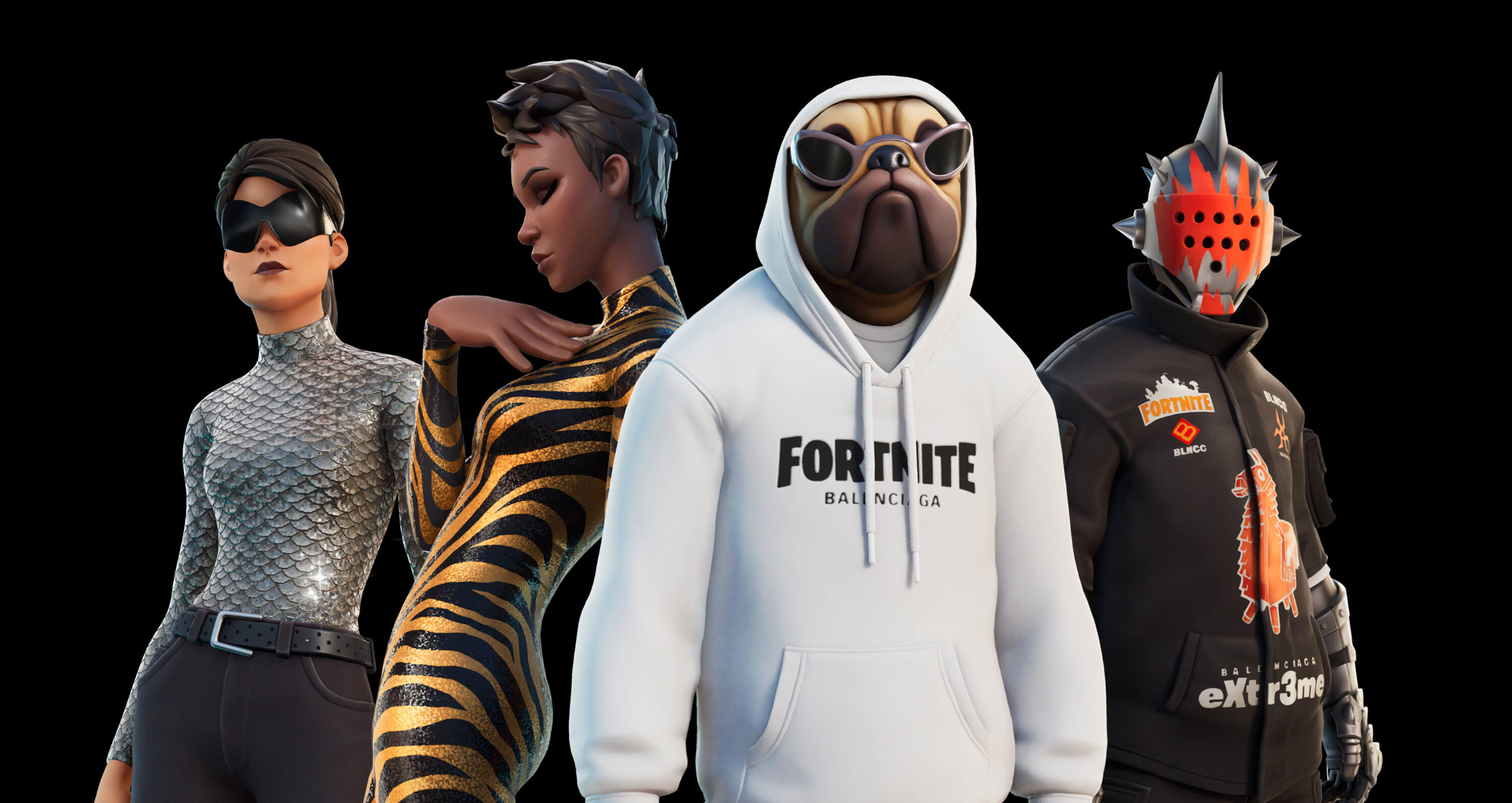 발렌시아가는 2021년 포트나이트와 콜라보를 진행했습니다. 포트나이트의 캐릭터들이 입은 발렌시아가의 의상은 게임 안에서 완판을 이뤄냈을뿐더러, 동일한 디자인으로 출시된 현실 세계의 옷도 많은 관심을 받았습니다. 발렌시아가의 힙한 트레이닝 세트와 선글라스를 걸친 포트나이트의 캐릭터 ‘도고’ 외에도 세 캐릭터들이 발렌시아가 핏 의상을 입었어요.