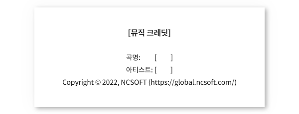 본 페이지를 통해서 배포하는 모든 음원은 온라인에서 활동하는 스트리머 및 콘텐츠 크리에이터를 지원하기 위함이며, 다음 명시된 규정을 준수한다는 조건 하에 무료로 사용할 수 있도록 허가한다. 단, 모든 음원의 저작권은 엔씨소프트에 있으며 이와 관련된 사항은 대한민국 법률의 적용을 받는다.