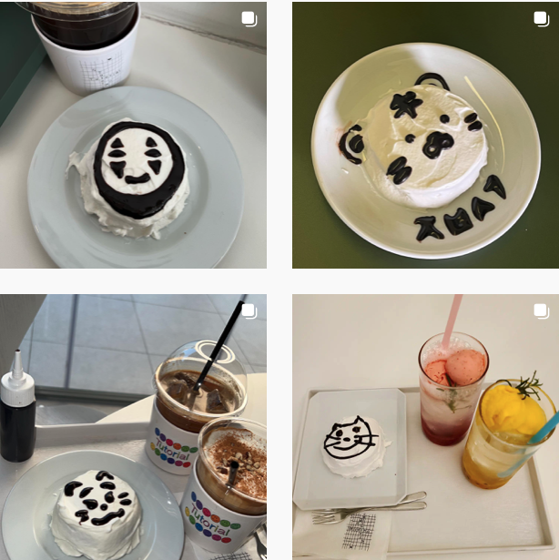 구겨진 종이케이크는 화이트 크림으로 시트가 덮여있는데요. 이걸 주문하면 초코 시럽이 같이 나와요. 케이크는 브라우니+크림 조합이라 맛은 보장이 되어있고, 그 위에 직접 자신이 원하는 그림을 그릴 수 있기 때문에, 많은 사람들이 반려견이나 최애 그림을 그리면서 놀기도 해요. 진짜 간단하게만 그려도 희한하게 스타일이 살아서 그리는 재미도 있고요. 호랑이 도넛이 받는 사람마다 제각각 다른 제품을 받아서 재밌는 유행으로 등장했다면, 튜토리얼 카페의 케이크는 거기에 덧붙여 내가 직접 그리기 때문에 개성이 덧붙여진 인증샷이 가능하다는 점이 재밌게 다가오는 것 같습니다.