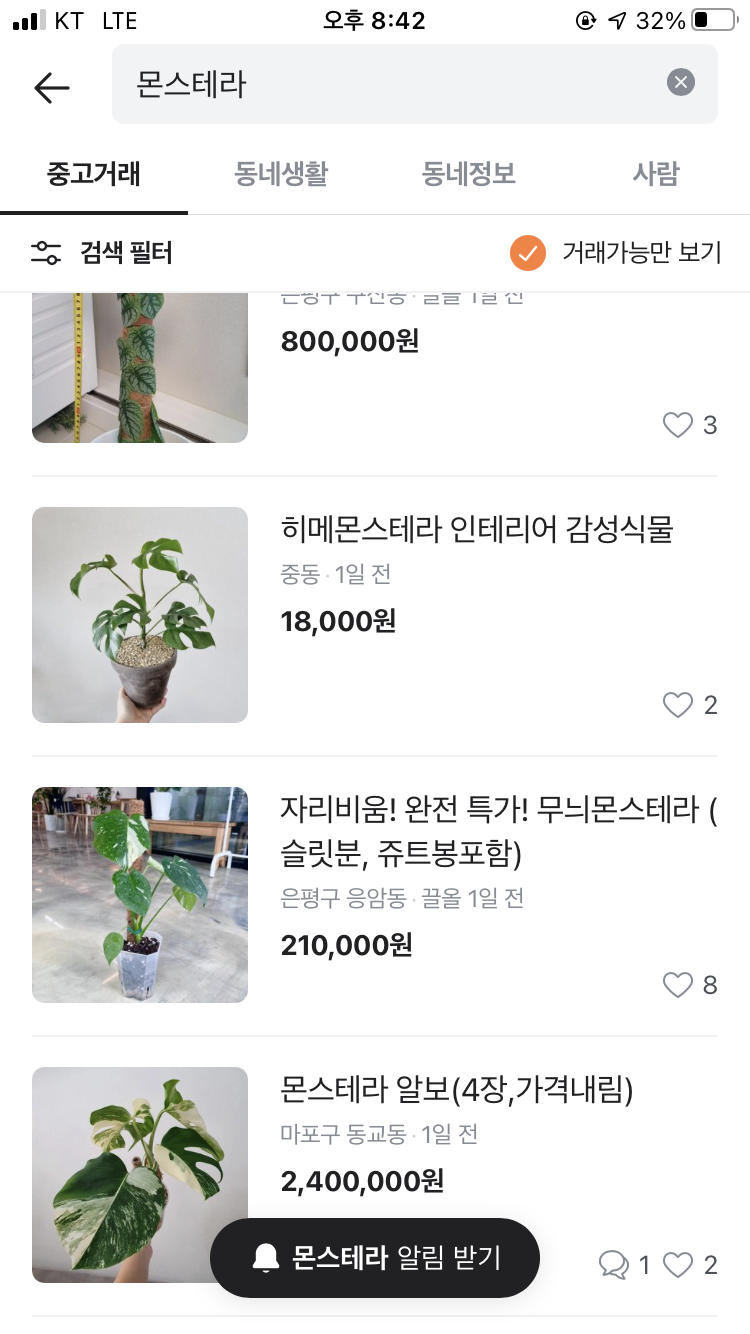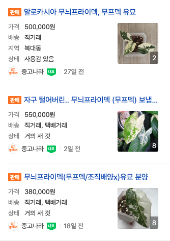 또 ‘식테크’도 식집사들의 유입을 늘린 요인이기도 했죠. 잎 한 장에 100만 원을 호가하는 희귀 식물들은, 잘 키워서 리셀하면 주식 못지않은 재테크가 될 수 있다는 생각들을 만들었습니다. 당장 당근마켓에만 검색해봐도 몬스테라 알보나 무늬 프라이덱 같은 인기 있는 식물들은 1,2백만 원 대도 쉽게 찾아볼 수 있었는데요. 인스타에서도 몬스테라 알보가 태그 된 게시물은 1만 3천 건이 넘어요. 그만큼 희귀 식물들에 대한 관심이 높아지고 있습니다.
