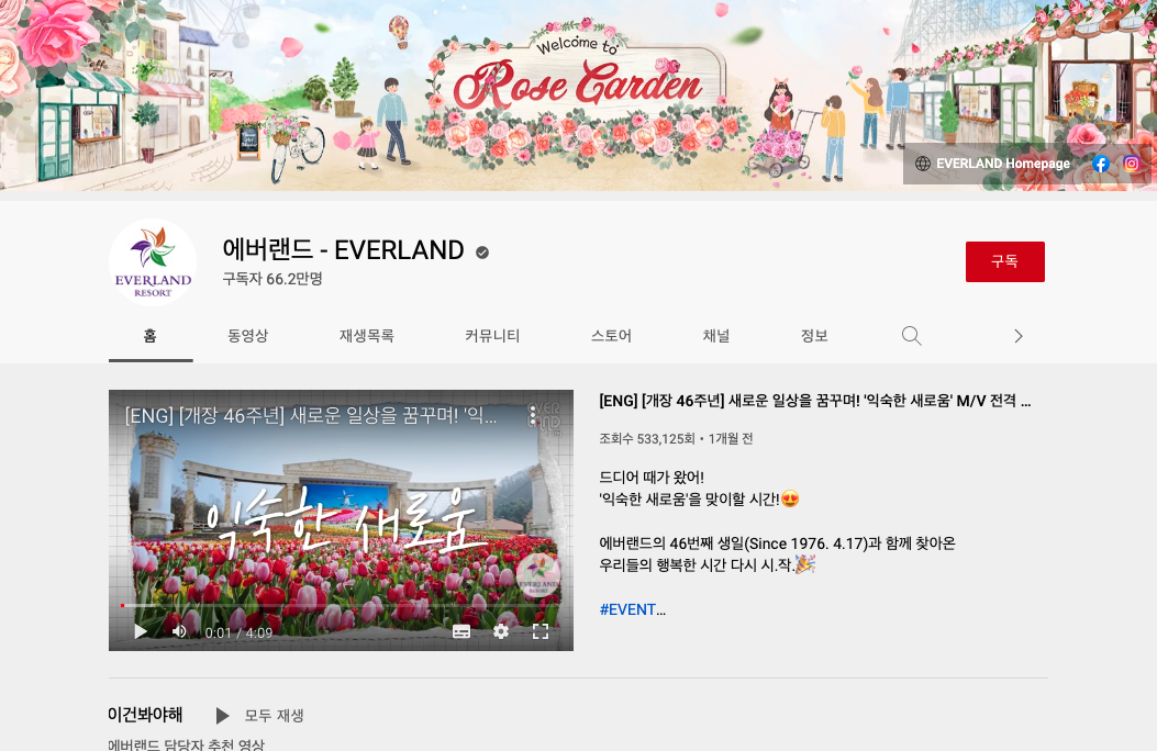 에버랜드-EVERLAND의 구독자 수는 66.2만 명으로 적지 않은 수를 보유하고 있는데요. 각각의 콘텐츠들을 적절하게 분리시켜서 채널을 다양화함과 동시에 한 채널의 컨셉을 명확하게 유지해나가고 있다는 점도 눈에 띕니다.