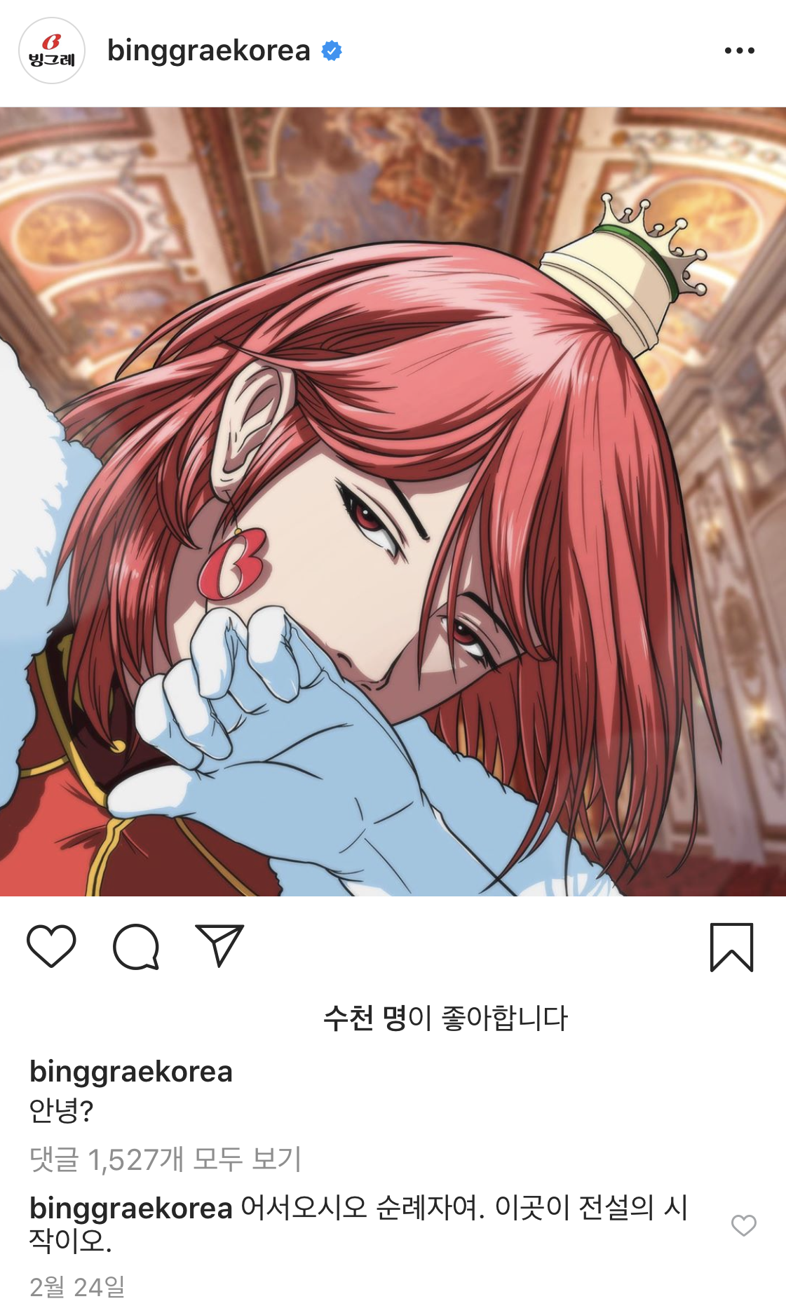 이런 작업을 통해서 빙그레는 2020년 ‘빙그레우스 더 마시스’라는 캐릭터를 공개하면서 엄청난 반응을 이끌어냈습니다. 뜨거운 반응은 금새 성과로도 이어져, 인스타그램 팔로워 수는 단번에 상승했습니다. 현재 17만명에 달한다고 하네요. 처음 빙그레우스가 공개되었을 때는 '계정 해킹 당한 거 아니냐'는 댓글까지 달릴 정도였으니, 당시에 이 브랜드가 얼마나 파격적인 시도를 했는지 상상이 가시죠. 이렇게 빙그레가 가장 먼저 쏘아올린 세계관 마케팅의 성공은 곧장 다른 기업으로도 이어지면서, 업계의 마케팅 트렌드를 변화시켰습니다.