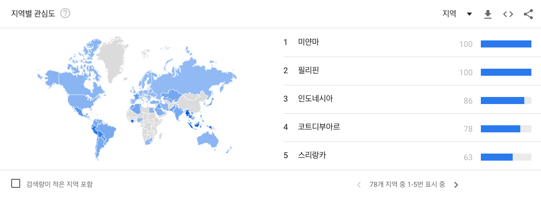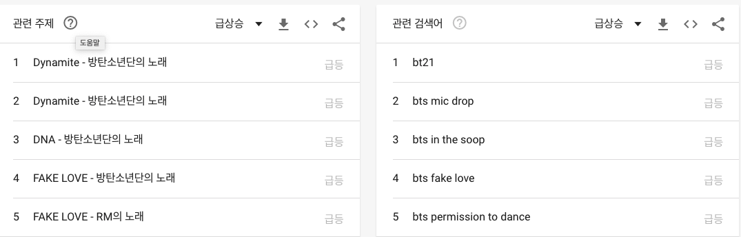 이때 검색 범위를 특정 국가나 전세계로 조정을 할 수도 있는데요. 기간이나 주제의 카테고리, 검색 채널 등등을 조건으로 한정시킬 수도 있어요. 또 같은 키워드를 지역별로도 나눠서 볼 수가 있는데요. 아래 사진은 'BTS'에 대한 지역별 관심도를 측정한 결과입니다. 어떤 지역에서 'BTS'에 대한 관심도가 높았는지 순위별로 목록화가 되어있어요. 그 밑으로는, 자신이 검색한 키워드와 관련된 주제나 관련 검색어를 보여주고 있는 모습입니다.