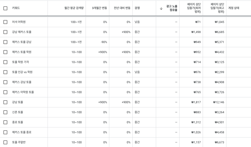 구글 키워드 플래너는 CPC(Cost per Click)를 활용하는 마케팅에 적합한데요. 키워드 플래너에 관심 있는 키워드를 검색하면, 해당 키워드의 월평균 검색량, 기간 별 변동률, 광고 게재 위치의 경쟁 수준, 광고 노출 점유율, 페이지 입찰가의 최고/최저 범위를 보여줍니다. 저는 '토플 학원'이라는 키워드를 검색해보았는데요. 이 키워드와 연관된 키워드에는 어떤 것들이 있는지, 그리고 그 키워드들의 핵심 의미들을 파악할 수 있을 뿐만 아니라 구글 애즈의 광고 단가를 보면서 어떤 키워드가 경쟁력이 있는지 확인을 해나갈 수 있습니다.