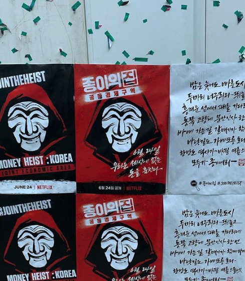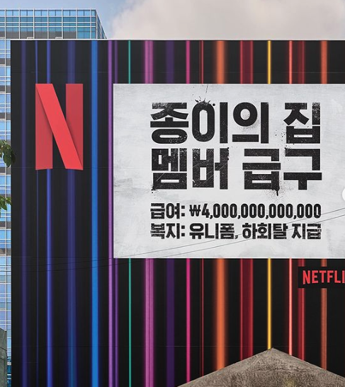 넷플릭스 최고 인기 오리지널 시리즈 중 하나인 <종이의 집>이 한국판 리메이크 버전으로 공개되었어요. 워낙 전세계적으로 큰 관심을 받았던 작품이었기 때문에 리메이크 공개를 앞두고 넷플릭스 본사에서도 국내외를 막론하고 다양한 프로모션 마케팅을 진행했죠. 그중 성수동에 설치된 <종이의 집:공동경제구역> 옥외광고 캠페인은 많은 이들의 이목을 집중시켰는데요, 그 외에도 하회탈을 쓴 강도단이 다섯 곳의 범행 장소를 습격할 거라고 예고하는 게릴라 포스터가 합정, 홍대 등 곳곳에 부착돼 있어 흥미를 이끌었답니다.
