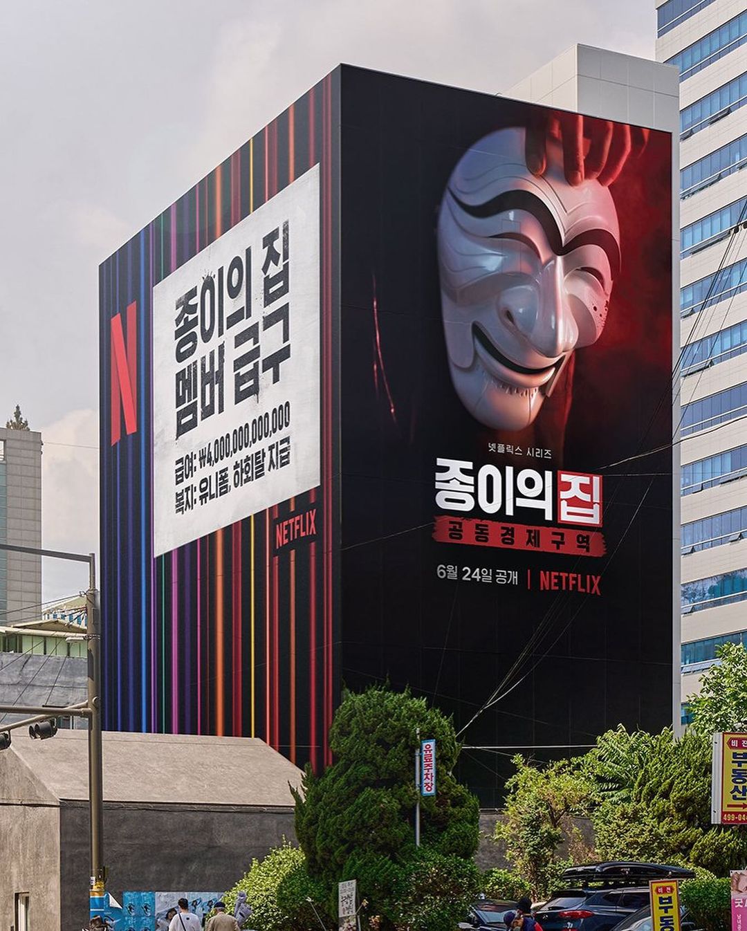 넷플릭스 최고 인기 오리지널 시리즈 중 하나인 <종이의 집>이 한국판 리메이크 버전으로 공개되었어요. 워낙 전세계적으로 큰 관심을 받았던 작품이었기 때문에 리메이크 공개를 앞두고 넷플릭스 본사에서도 국내외를 막론하고 다양한 프로모션 마케팅을 진행했죠. 그중 성수동에 설치된 <종이의 집:공동경제구역> 옥외광고 캠페인은 많은 이들의 이목을 집중시켰는데요, 그 외에도 하회탈을 쓴 강도단이 다섯 곳의 범행 장소를 습격할 거라고 예고하는 게릴라 포스터가 합정, 홍대 등 곳곳에 부착돼 있어 흥미를 이끌었답니다.
