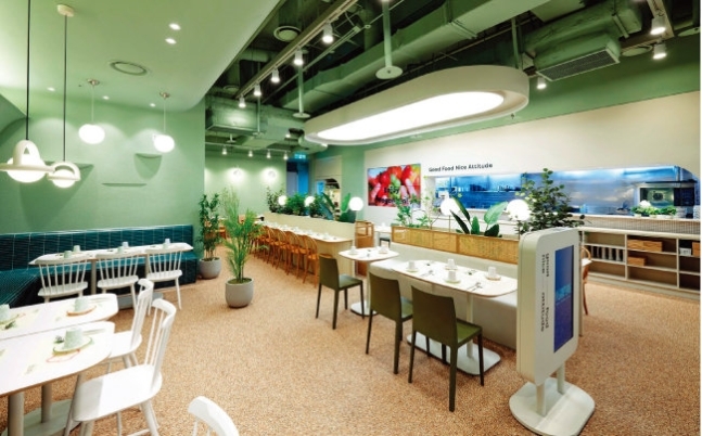 특히 플랜튜드는 식물성 단백질과 대체육을 활용한 퓨전 메뉴가 일품이에요. ‘플랜트 소이불고기 덮밥’ ‘두부 카츠 채소 덮밥’ ‘크럼블두부 비빔밥&순두부 스튜’ 등 흥미롭고 재미난 메뉴가 가득하죠. 새로운 음식을 도전하고 향유하고 싶어 하는 MZ 세대의 입맛을 그대로 반영한 풍경이라고도 볼 수 있을 것 같습니다. 또 메뉴뿐만 아니라 지구와 환경이 연상되는 그린 베이스 공간이 공을 많이 들인 느낌도 들어요.