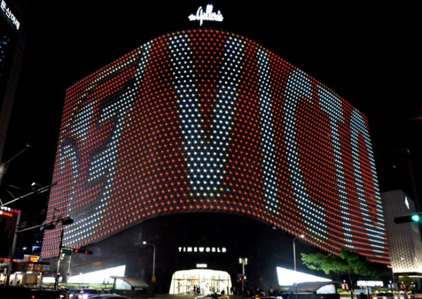 얼마 전에는 한화이글스와 같은 계열사에 속하는 대전 갤러리아타임월드에서 한화이글스와 승리(Victory)를 이용해 레터링을 만들어 미디어 파사드를 백화점 외관에 전시하기도 했어요. 갤러리아 백화점은 이렇게 외관을 전시할 뿐만 아니라 대전에서 열리는 홈경기에서 한화이글스가 승리할 때마다 100만원을 적립해 지역복지센터에 기부하려는 계획입니다.