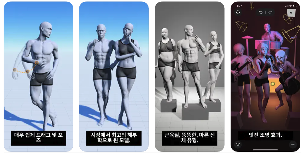 <매직포저>는 인물의 다양한 체형과 포즈를 쉽게 따라그릴 수 있도록 예시를 보여주는 어플이에요. 구도와 정확한 동작이 생각나지 않아서 구글링으로만 해맸다면, 이 어플이 안성맞춤입니다! 특히 3D 캐릭터 포즈 취하기, 장면 생성, 조명 효과 등을 이용하여 보다 효율적이고 효과적으로 인체를 이해할 수 있도록 도와주고 있어요. 게다가 사용 방식도 무척이나 쉽고 간단합니다. 어플에 빠르게 적응하고 시작할 수 있도록 단계별 동영상 튜토리얼을 제공하기 때문이에요. 인체의 아웃라인만을 보여주지 않고, PNG와 OBJ로 내보내서 각각 2D, 3D 포맷까지 섭렵할 수 있답니다. 또 획일적인 모습이 아니라 근육질, 마른, 뚱뚱한, 작은 등 다양한 신체 유형을 변형하여 캐릭터에 적용해볼 수 있어요. 나만의 웹툰을 만들기 위해 필요한 기본 단계를 완성해줄 거예요.