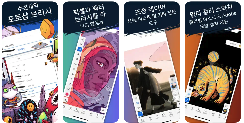 <어도비 프레스코>는 간단히 말해서 스케치, 그리기, 벡터 아트 디자인과 유화 등을 적용해볼 수 있도록 해주는 어플이에요. 어도비 펜슬과 아이패드, 아이폰 전용으로 특별히 제작된 무료 페인팅 앱이지요. <어도비 프레스코>의 가장 자랑스러운 기능은 바로 세 가지 종류의 유려한 브러시예요. 실제 수채와나 유화를 사용하듯 페인트 할 수 있는 '라이브 브러시', 모션 도구를 활용해서 애니메이션을 완성하는 '벡터 브러시', 포토샵에서 호환할 수 있는 모든 종류의 '픽셀 브러시'까지. 50가지가 넘는 다채로운 브러시를 통해 내가 원하는 입체감, 질감, 느낌 등을 그림으로 바로 구현할 수 있죠. 나만의 작품을 더 고차원적으로 한 단계 발전시키고 싶다면, <어도비 프레스코>를 통해서 효율성을 한번 경험해 보세요!