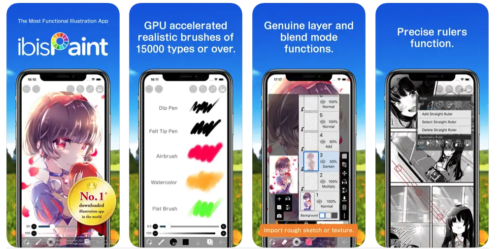 <어도비 프레스코>보다 조금 더 간단하고 쉬운 버전의 페인팅 어플인 <이비스 페인트 X>는 PC의 일러스트 소프트를 연상하는 다양한 기능을 갖추고 있어요. 최대 120fps의 매끄럽게 그려지는 브러시부터 무제한으로 추가할 수 있는 레이어, 세로가로 형태&스트로크 글꼴 등 만화적 요소까지 갖추고 있어서 보다 쉽게 웹툰 작업에 임할 수 있어요. 게다가 그림 그리는 과정을 동영상으로 촬영해서 밖으로 내보낼 수 있기 때문에, 내가 작업해 나가는 모든 시간을 기록하고 다른 사람들과 공유할 수 있다는 장점도 있습니다. 프라임 멤버십을 결제할 경우, 프라임 서체, 다양한 색상 변경 필터, 레벨 조정 필터 등 더 고급화 된 기능을 쉽게 이용할 수 있기도 합니다. 최초 1개월은 프라임 멤버십으로 모두 활용할 수 있기 때문에 모두 경험해 본 뒤 사용해도 좋을 것 같아요!