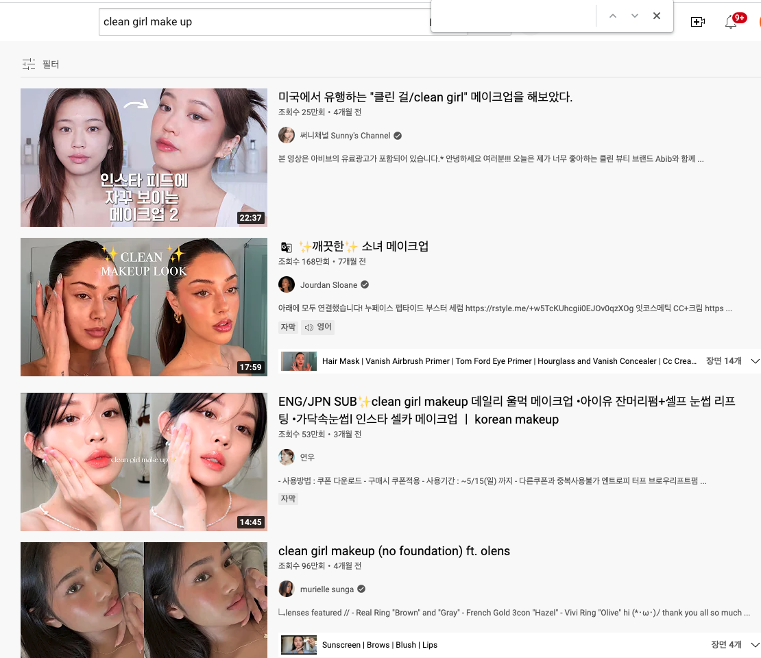올해 미국에서 클린걸 메이크업 clean girl make up이 유행하고 있다는 것 아시나요? 2010년대 초부터 컨투어링과 볼륨을 강조한 카일리 제너 스타일이 미국뿐만 아니라 세계적으로도 유행했다면, 클린걸 메이크업은 자연스러움과 투명한 스타일을 강조하는 어떻게 보면 정 반대의 트렌드라고 할 수 있어요. 클린걸 메이크업은 Y2K의 표본으로 불리는 2004년 영화 <퀸카로 살아남는 법>의 레이첼 맥아담스의 스타일링이 다시 유행하기 시작하면서 이어진 흐름이라고 볼 수 있는데요. 유튜브에서도 메이크업 튜토리얼 영상을 쉽게 찾을 수 있는데요. 모두 높은 조회수를 기록하고 있는 걸 알 수 있어요.