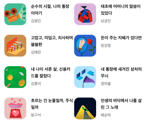 핀테크 기업들이 스토리텔링을 승부수로 한 콘텐츠를 만들기 시작했는데요. 최근에는 카카오뱅크가 소설가 8명과 함께 에세이를 발표했어요. 이전에 배달의 민족이 음식을 가지고 푸드 에세이를 연재하거나 29CM나 현대백화점에서 소설가들과 협업했던 내용을 소개해드린 적이 있는데요. 이번에는 금융 기업인 카카오뱅크가 '돈, 에세이를 만나다'라는 제목으로, 이름만 들어도 글이 궁금해지는 유명 소설가들을 영입해서 에세이를 연재했어요. 언뜻 경제와는 거리가 있어보이는 '문학'을 가지고서 ‘금융’이라는 내용을 풀어내는 글들을 읽고 있으면, 내 생활과 직접적인 연관성을 갖는 경제에 대한 인사이트가 넓어지는 것 같아요.
